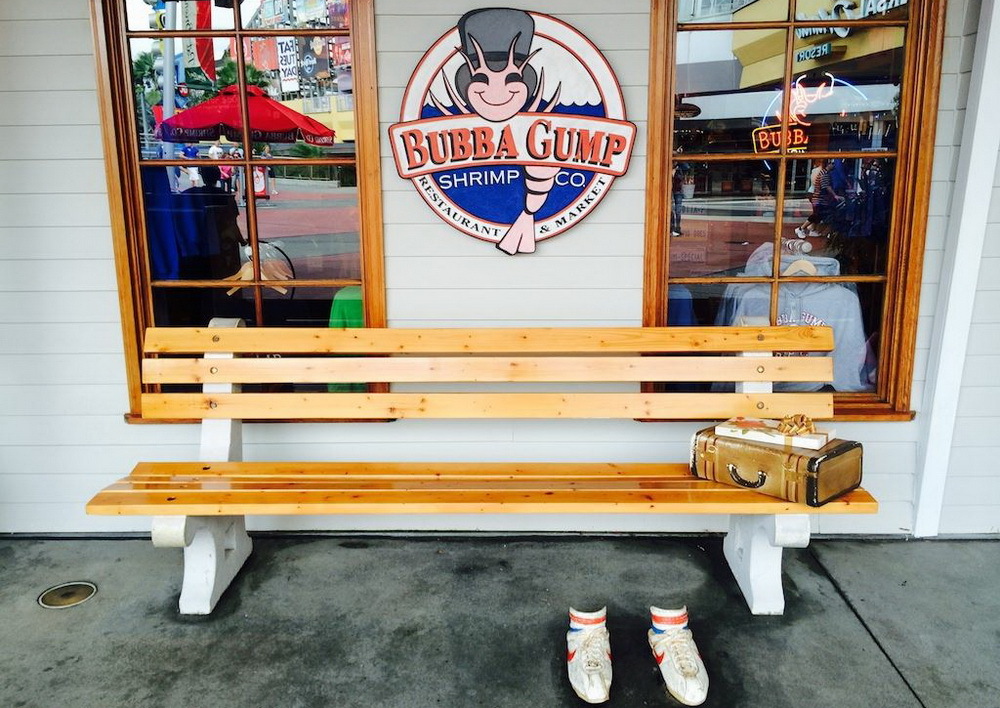 На столе стоит табличка с двумя надписями. Если тебе нужен официант, выбираешь надпись «Run Forest run!», если у тебя все ок и тебе ничего не нужно, выбираешь «Stop Forest» (если не ошибаюсь). Что касается рациона, то тут и правда огромное количество блюд из креветок. А на входе у такого ресторана всегда стоит та самая лавочка из фильма, на которой он и рассказывал свою историю.