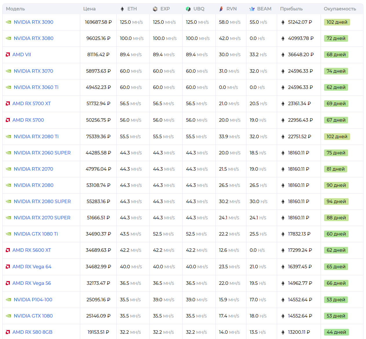 Подводя итог: курс биткоина поднялся, потянул за собой остальные альткоины, которые можно добывать на видеокартах, и такая добыча стала снова приносить большие деньги. Просто для примера, та же RTX 3080 может приносить более 30 тысяч рублей в месяц, что даже при текущей стоимости позволяет ее окупить менее чем за полгода. Даже старая добрая GTX 1060 с 6 ГБ подарит вам 6-7 тысяч в месяц — хватит чтобы оплатить не только электричество, но и коммуналку в целом.