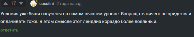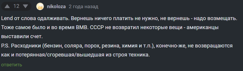В свете последних событий, хотелось бы узнать, поменялось ли мнение у подобных комментаторов? Или они все еще верят в супер выгодный ленд-лиз, а то и вовсе, что все оружие было отдано БЕЗ-ВОЗ-МЕЗ-ДНО?