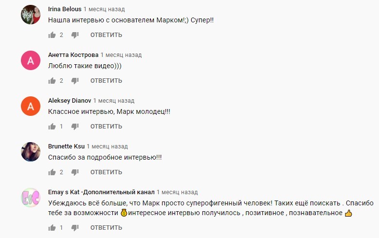 Зрители хвалят и самого Марка, и его проект. Интересно, что отзывы написаны примерно в одно время и выглядят подозрительно однотипными. Некоторым зрителям, видать, так понравилось интервью, что они решили написать сразу несколько комментариев, выражая свой восторг.