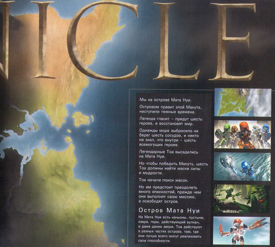 Именно с первых страниц начинается погружение в историю нового мира - остров Мата Нуи, злой дух Макута, звери - раи, священники (косяк перевода, он тогда выполнялся компьютером без адаптации - в оригинале скорее должен быть "вождь"). Вместе с новыми необычными названиями и именами вводится и элемент масок силы, что в дальнейшем (в 2006 году) поломает саму логику сюжета.