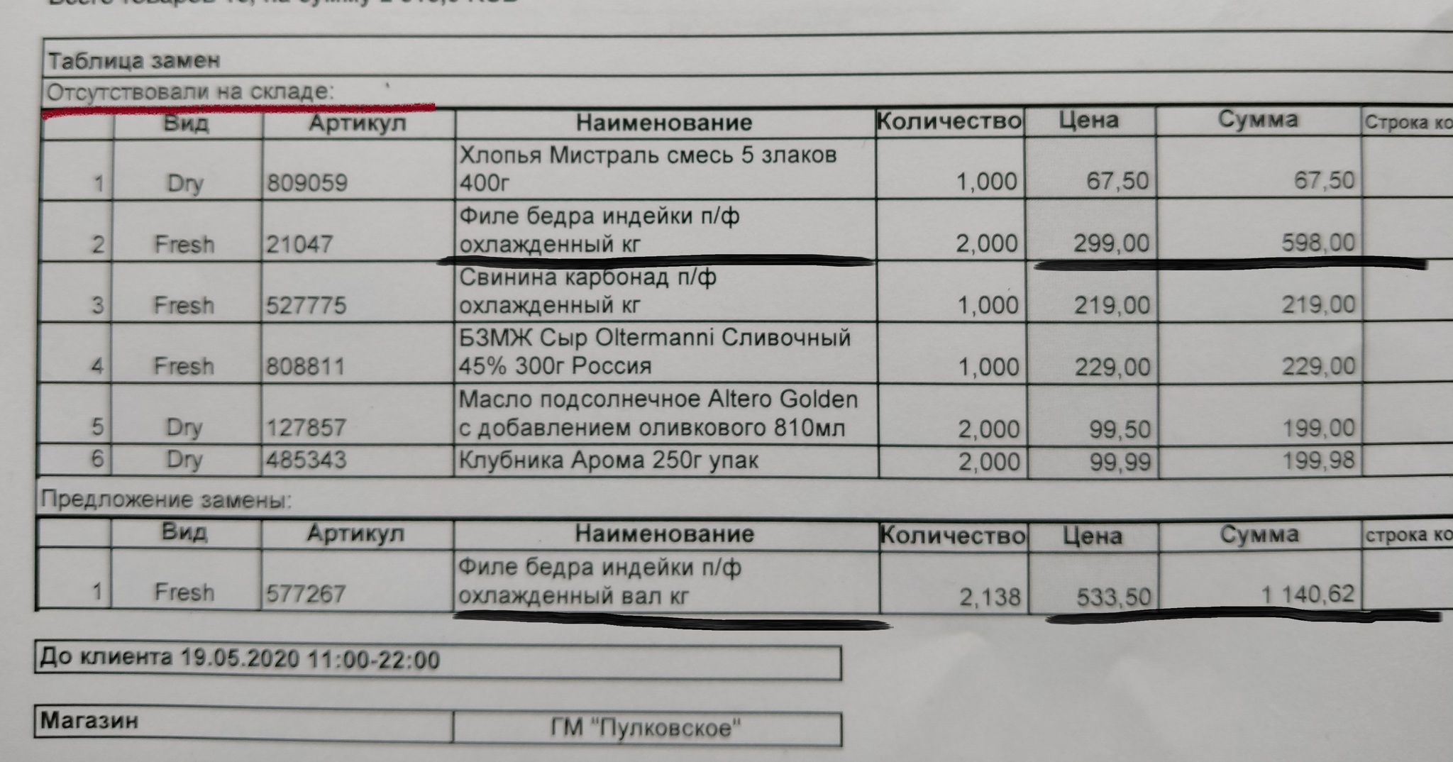 Заказ был сделан меньше, чем за сутки до доставки. Замены в заказе были запрещены.