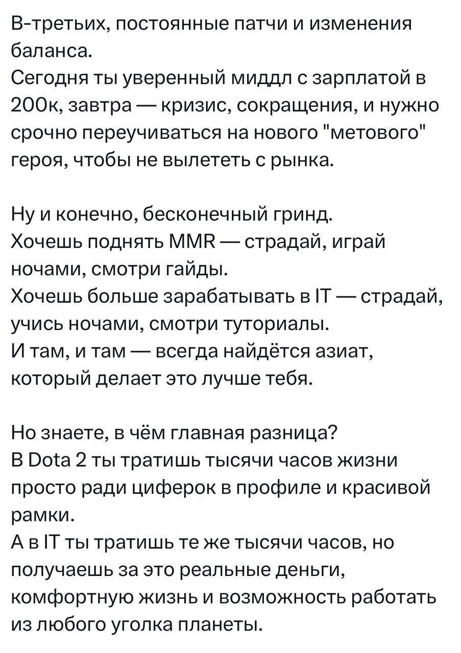 42 asanbek.best IT-юмор Что общего у Dota 2 и работы в IT ? 9 месяцев назад Dota 2 Компьютерные игры Видеоигра Работа IT Сравнение Длиннопост Скриншот 1 Ещё 0