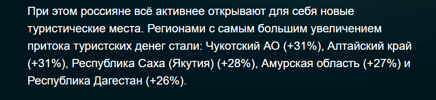 Тот же источник делает однозначный вывод - траты на отдых, туризм, путевки пошли вниз. Лидерами популярных направлений традиционно стали нерезиновые Москва и Московская область, Санкт-Петербург и Ленинградская область, Сочи и Краснодарский край. Чукотка и Дагестан - самые активно растущие туристические кластеры. На серьезных щах.