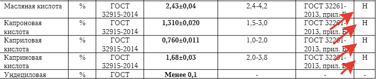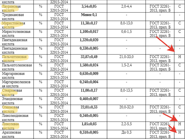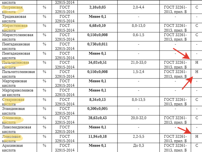Желтым я выделяю те кислоты, которые будут участвовать в подсчетах, стрелочками указываю на показатели, которые не соответствуют нормам.