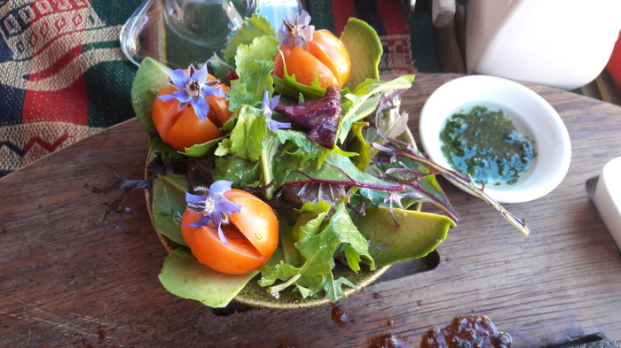 Блюдо на фото в меню значилось как "овощи на гриле". Сначала я подумала, что одними овощами не наемся, потому что представила себе стандартные 99 граммов, которые подают в российских кафе, а потом я увидела ЭТО! Оно занимало весь стол по ширине, а стакан с напитком был величиной почти с мою голову. Овощи шипели скворчали на горячем камне, к ним подали 4 вида соуса и салат, украшенный цветами.