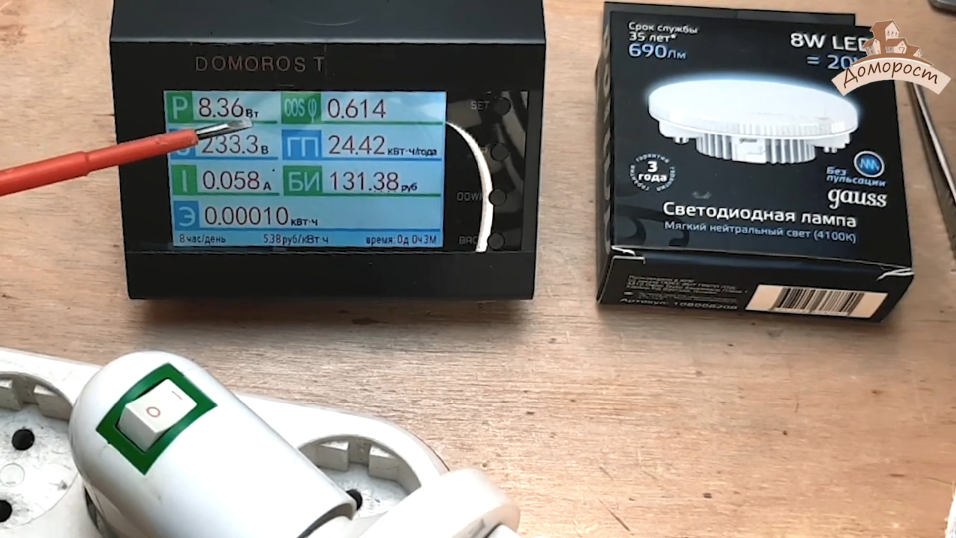 Оставлю лампу поработать 15ть минут, посмотрим что из этого получится. После прогрева лампы наблюдаю прекрасный результат — 8 Вт мощности, ровно то, что заявлял производитель.