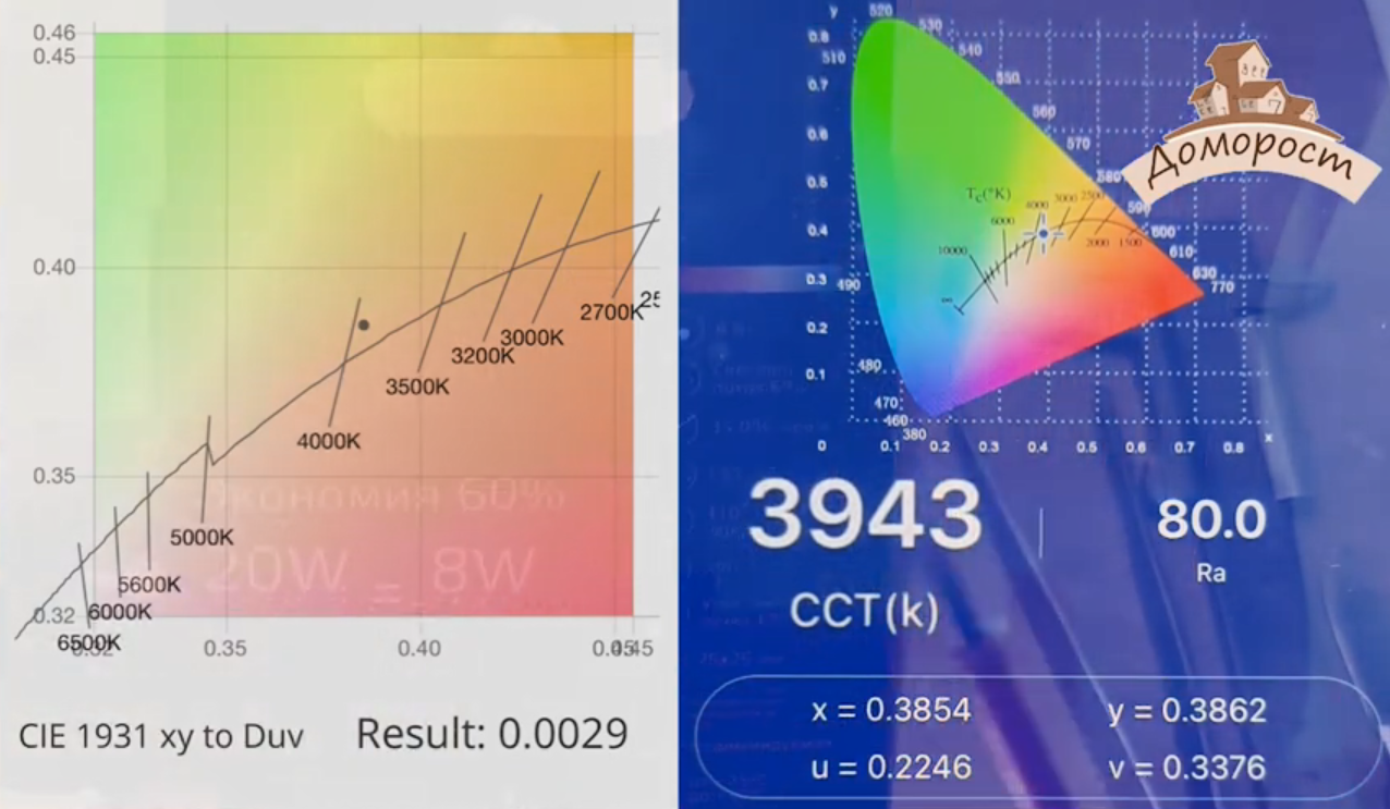 Давайте посмотрим теперь на эту лампочку с точки зрения качества света. Гаусс обещает цветовую температуру 4100 К. По факту же получилось 3943 К. Коэффициент цветопередачи был заявлен более 90, а по факту — 80.