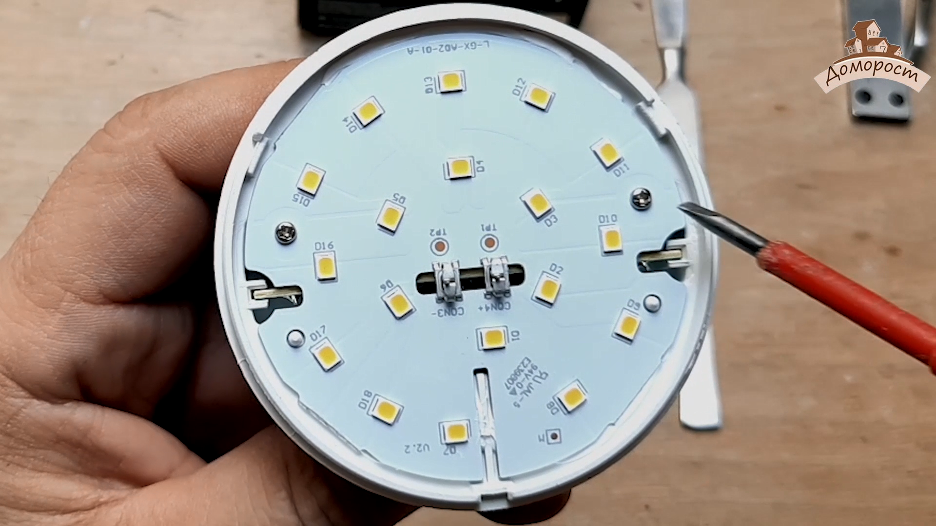 Итак, пора заглянуть внутрь лампочки. Снимаю колбу. Диодная плата прижата к корпусу парой саморезов. На плате 18 корпусов светодиодов, все соединены последовательно, внутри каждого корпуса угадываются два маленьких кристалла, но это мы еще уточним.