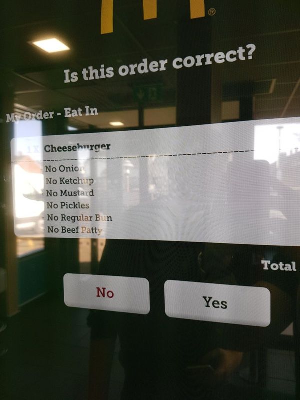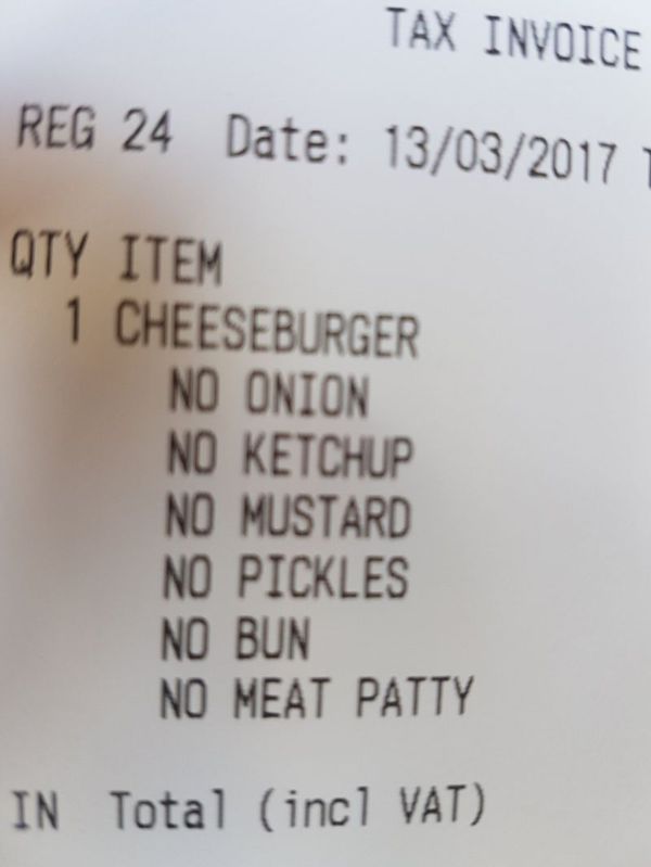 Британец заказал в McDonald's чизбургер без лука, кетчупа, горчицы, соленья, булочки и мяса, - по сути, без всего. В результате получил кусок сыра в коробке. "Я заказал сыр. Не знаю, чего я ожидал", - подписал он снимок с полученным заказом и чеком.
