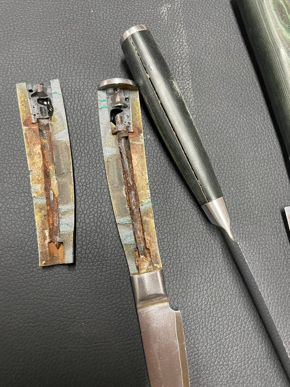 Вскрытие показало, что хвостовики клинков напрочь проржавели и вздулись, что и послужило причиной раскола рукоятки