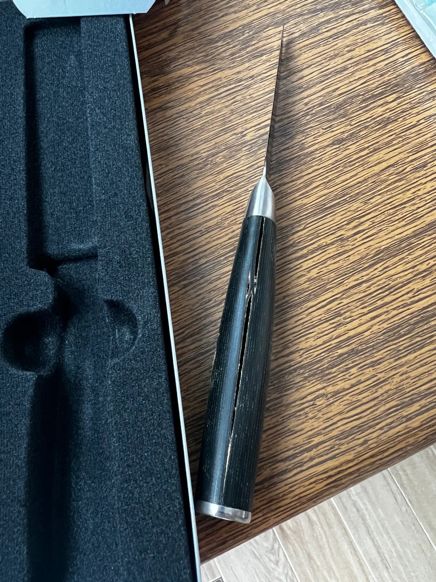 Обратился ко мне заказчик с очень популярной проблемой - замена ручек на кухонных ножах. Что удивило, ручки на ножах выполнены из микарты, а это довольно прочный материал на основе слоев ткани и синтетической смолы. Этим ножам много лет, и все это время их нещадно мыли в посудомоечной машине.