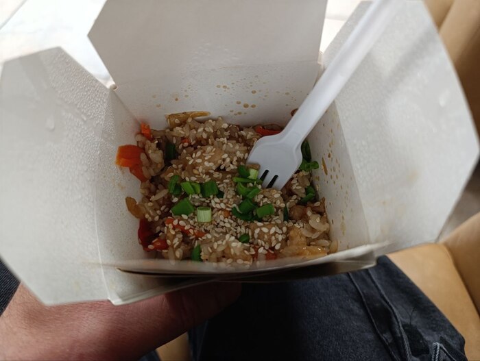 Час офигительного сна прервал доставщик. Наконец-то, в 7 утра принесли еду. Коробочка с лапшой. Но заказать попить догадаться они не смогли. Давимся рисом.
