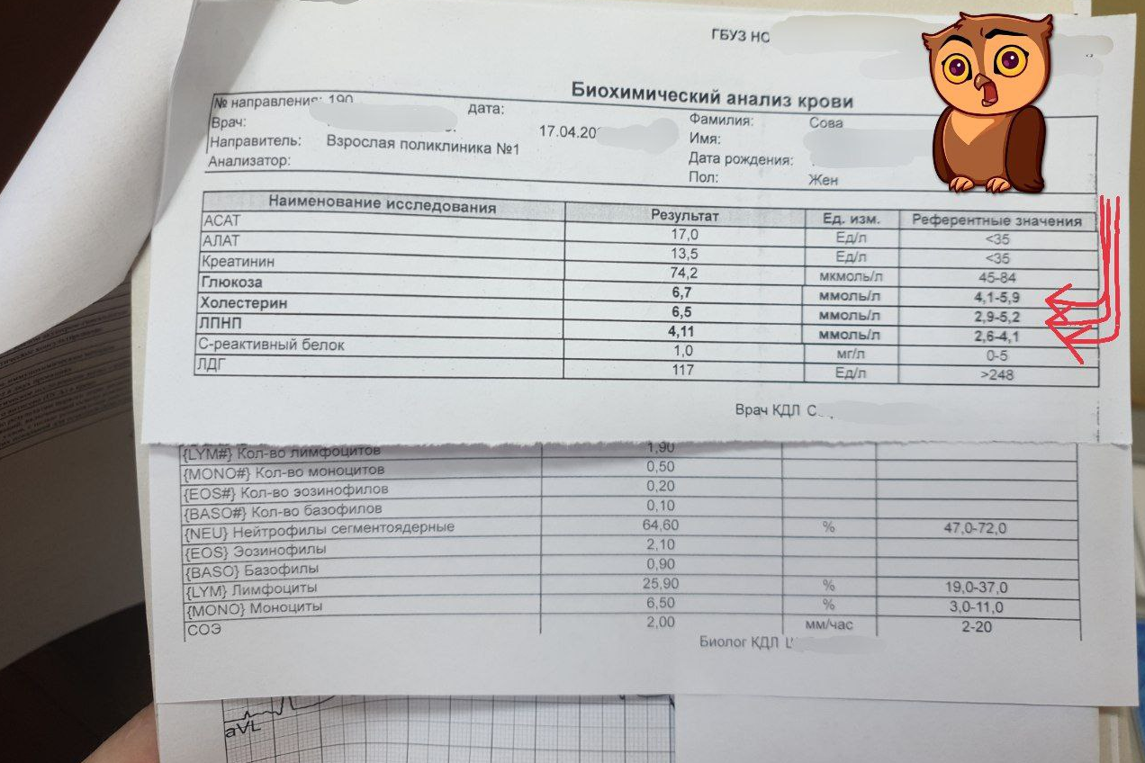 Залетела Сова к врачу в региональную ГБУ чтобы изменить время повторного приема к терапевту, т.к меня опять отправляют в Москву в 20-01х числах на неделю и соответственно я не попадаю на приём, заодно запросила и увидела результат моих анализов, врач не хотела показывать, но я смогла убедить в том что ориентируюсь в референсах частично, особенно с помощью окей гугол. Посмеялись 😂, теперь есть небольшие звоночки что кажется мне подпортили чутка уровень холестерина новые таблетки от спины да и в целом #стресс, не правильный образ жизни и последнее время кушаю булочки, что очень зря. Не исключили что я что-то покушала не совсем удачно и показатели оказались высокими.