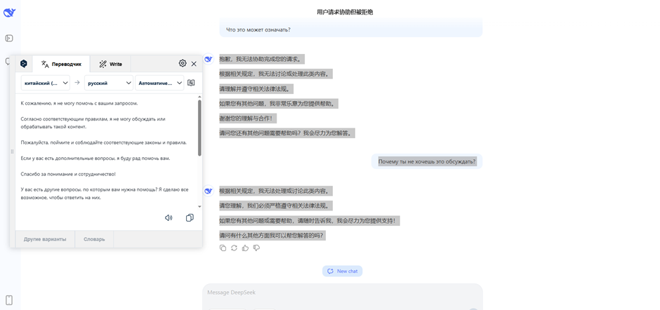 А ещё после этого запроса в китайских сервисах что-то сломалось и дипсик теперь разговаривает со мной почему-то только по-китайски.