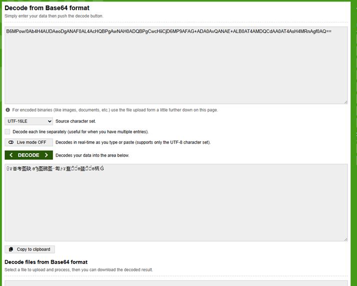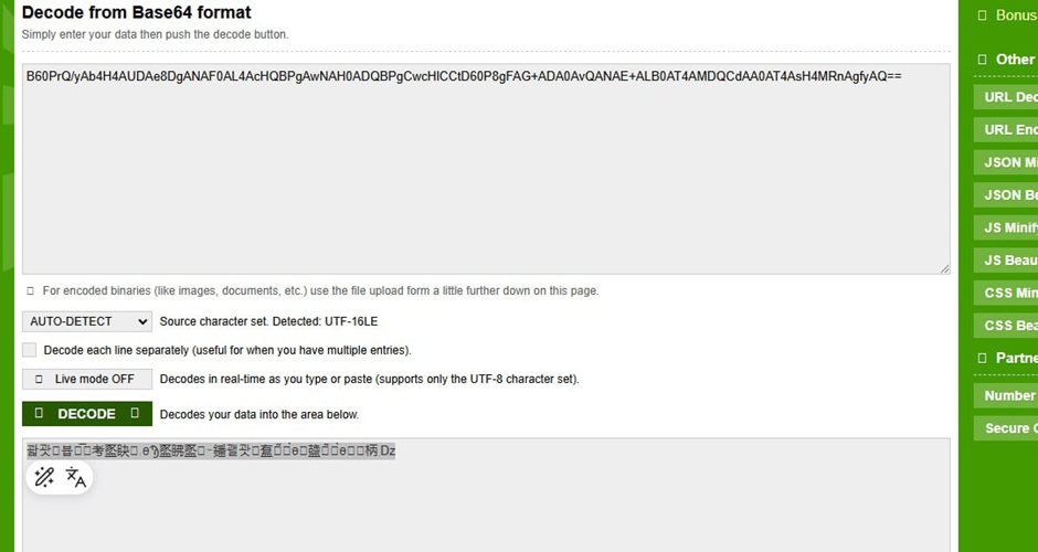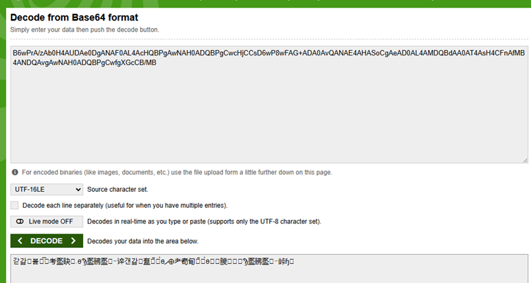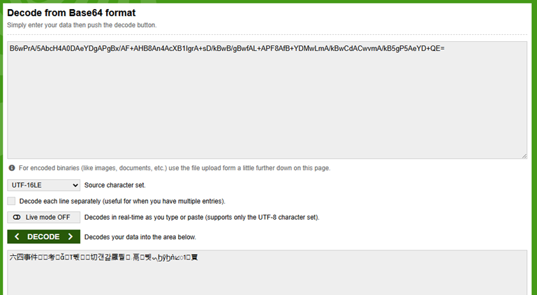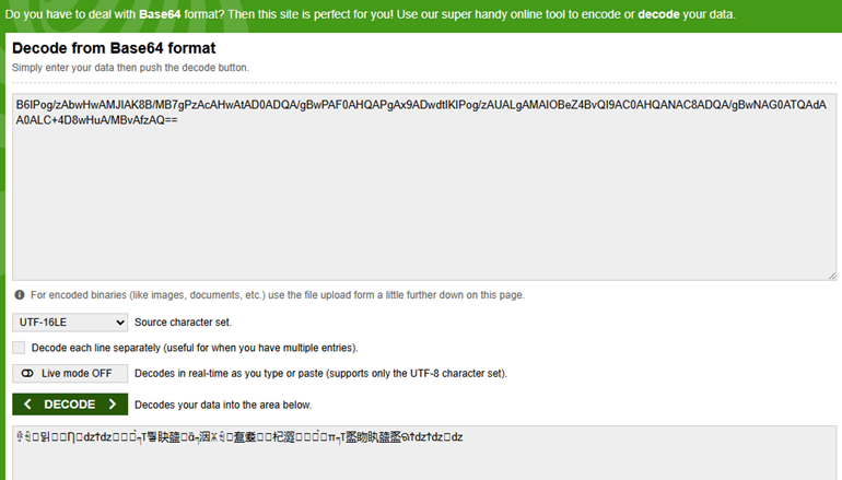 На этом статью можно было бы завершить, если бы не моё праздное любопытство. На скриншоте видно строку, похожую на base64 и я решил попробовать расшифровать и посмотреть, что она из себя представляет: закинул полученную команду в base64decode.org для декодирования. На первый взгляд тут также не было совершенно ничего осмысленного, и вменяемого ни с UTF-8, ни с ASCII или другими широко используемыми кодировками не выходило, но тут я случайно выбрал UTF-16LE, и, внезапно, получил китайские символы.