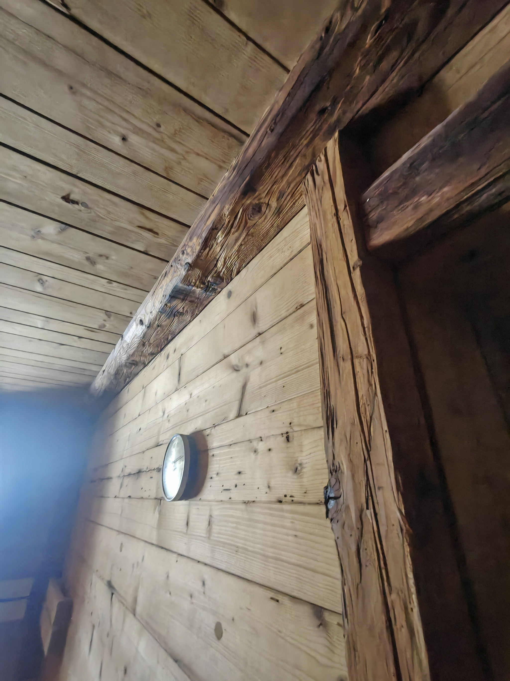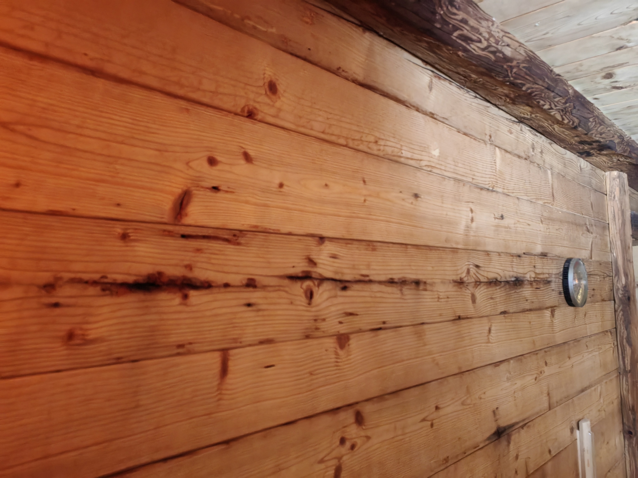 Бане досталось больше. Первая печка прогорела. Стояла харвия. Заказчик поставил новую но не очень доволен длительностью нагрева. 4-5 часов. Раньше нагревалась за 2-2.5часа. Парятся в ней часто. Не жалея воду. Есть на доске следы от воды. Доска на стенах и потолке не искусственно состаренная а реально старая. Со следами от короеда, механических повреждений и прочей радости. Обработана, выпаренная смола, небольшая термическая обработка для стабилизации. Полки из абаша. Светильники от компании Light 2000