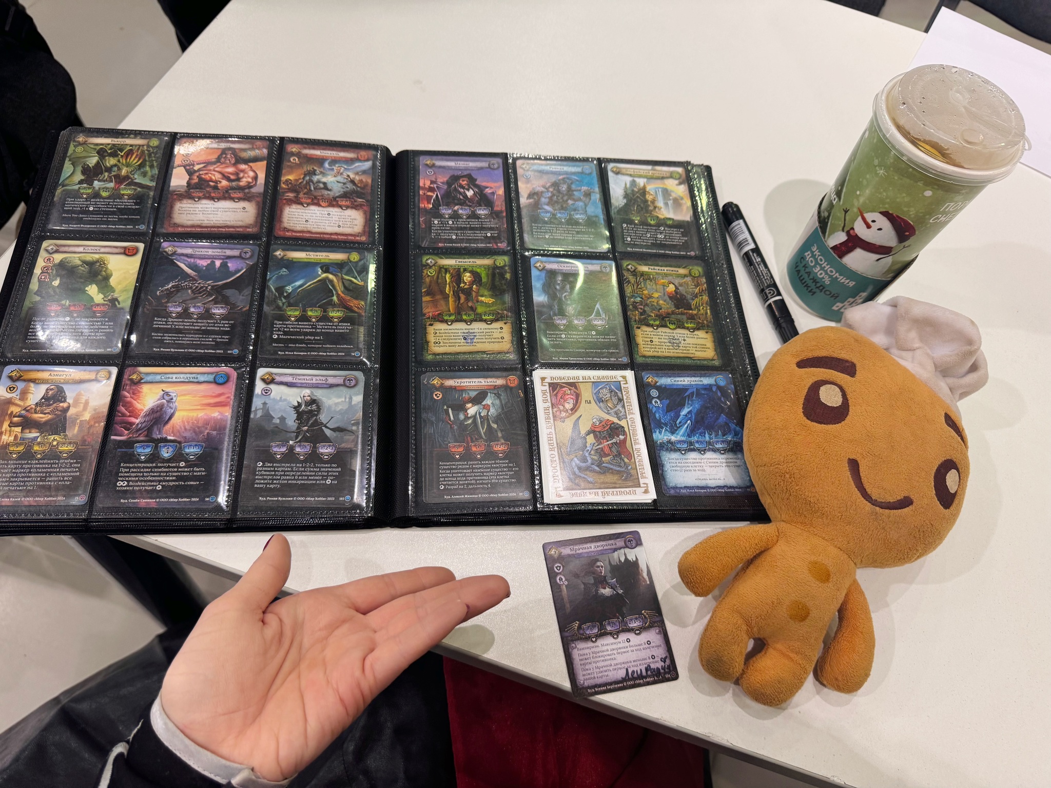 Между прочим, Берсерк игра по-настоящему коллекционная, это слово совсем не спроста фигурирует в названии жанра. Каждый год выходят новые карточки, у них есть своя редкость и ценность, и игроки отдельно собирают альбомы по тому принципу, который им нравится. Самые редкие, самые первые, карты определенного художников или типажей, в общем, кому что по духу. На ивентах игроки могут обмениваться этими картами друг с другом, пополняя свою колоду или коллекцию. И карточки с автографами авторов, конечно, отдельно ценятся.