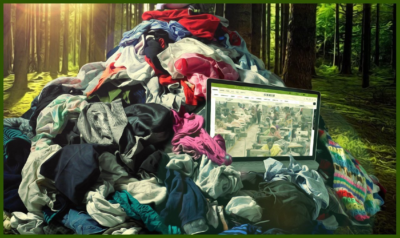 Описание изображения: Куча одежды лежит в лесу на фоне солнца, струящегося сквозь деревья. В куче лежит ноутбук, на котором видно изображение с веб-сайта SHEIN: ряды женщин, работающих за швейными машинами.