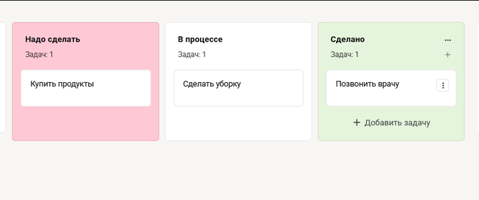 Создайте доску и разделите её на колонки: «Надо сделать», «В процессе», «Сделано».