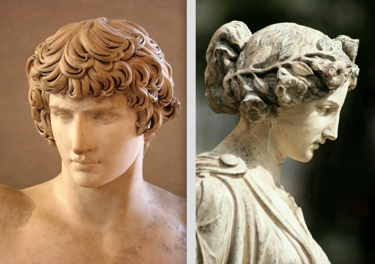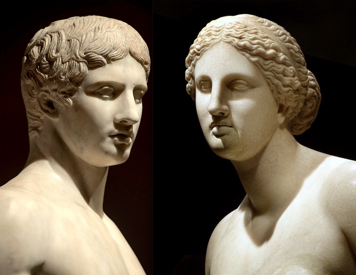 Сравним куроса и кору с мужским и женским скульптурными портретами работы древнегреческого скульптора Поликлета. Это уже и есть так называемый «период классики» – V век до новой эры. Сравните их с архаическими изображениями!