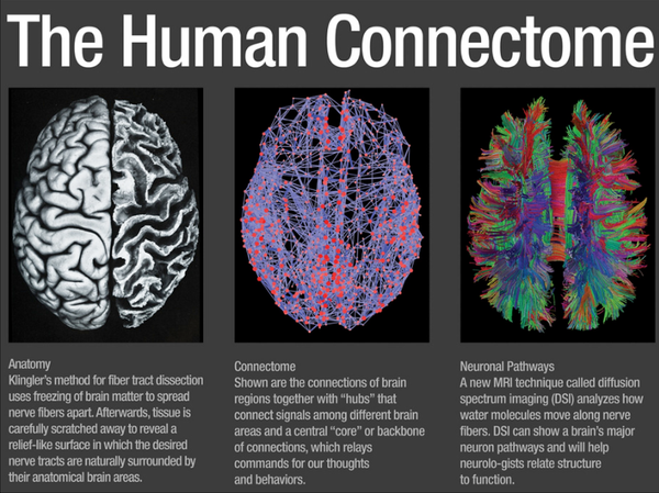 Анатомия, связи разных зон мозга и МРТ технологии, показывающие движение нейронные пути в мозге человека. Рисунок из статьи про синпатическую инженерию тут
