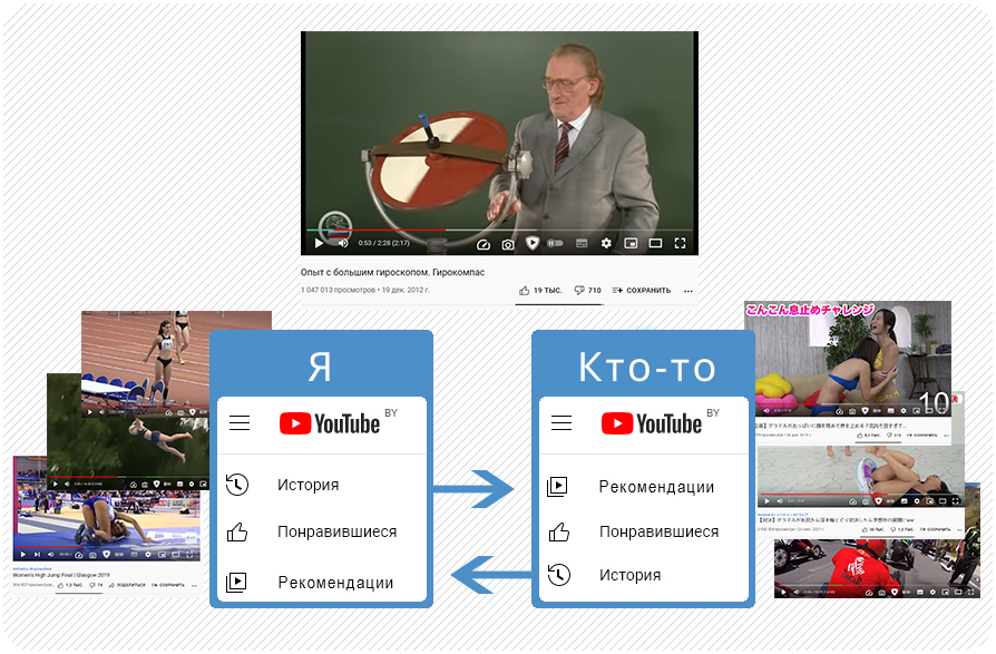 Приведу пример: я смотрю и одобряю пальцем разного рода талантливых спортсменов. Кто-то другой увлекается популярной японской музыкой с не менее талантливыми актёрами. Мы оба неведомой силой забрели на канал физиков-ядерщиков, где под впечатлением оба оценили труды профессора, точнее доцента, пальцем вверх. Ютюб это заметил и в дальнейшем я буду видеть высокооцененные японские культурные мероприятия, а этот кто-то будет просвещён спортом. Так же мы оба будем видеть ролики с канала физиков.