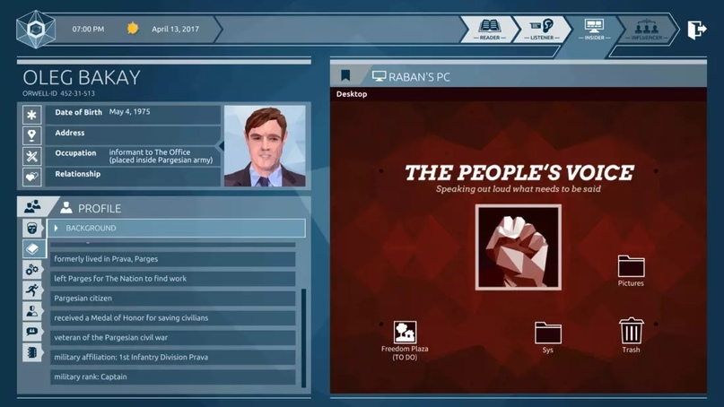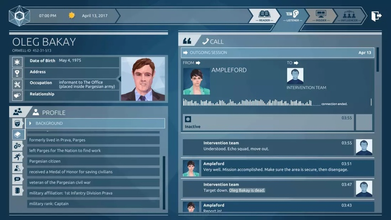 Создаем профиль, проходим тест и вот перед нами функционал программы ORWELL. Дабы не спойлерить в сюжете скажу лишь, что перед нами предстает неоднозначная история полная лжи, пропаганды, интриг и боли, погрузившись в которую очень не просто делать правильный выбор и следовать пути правды.