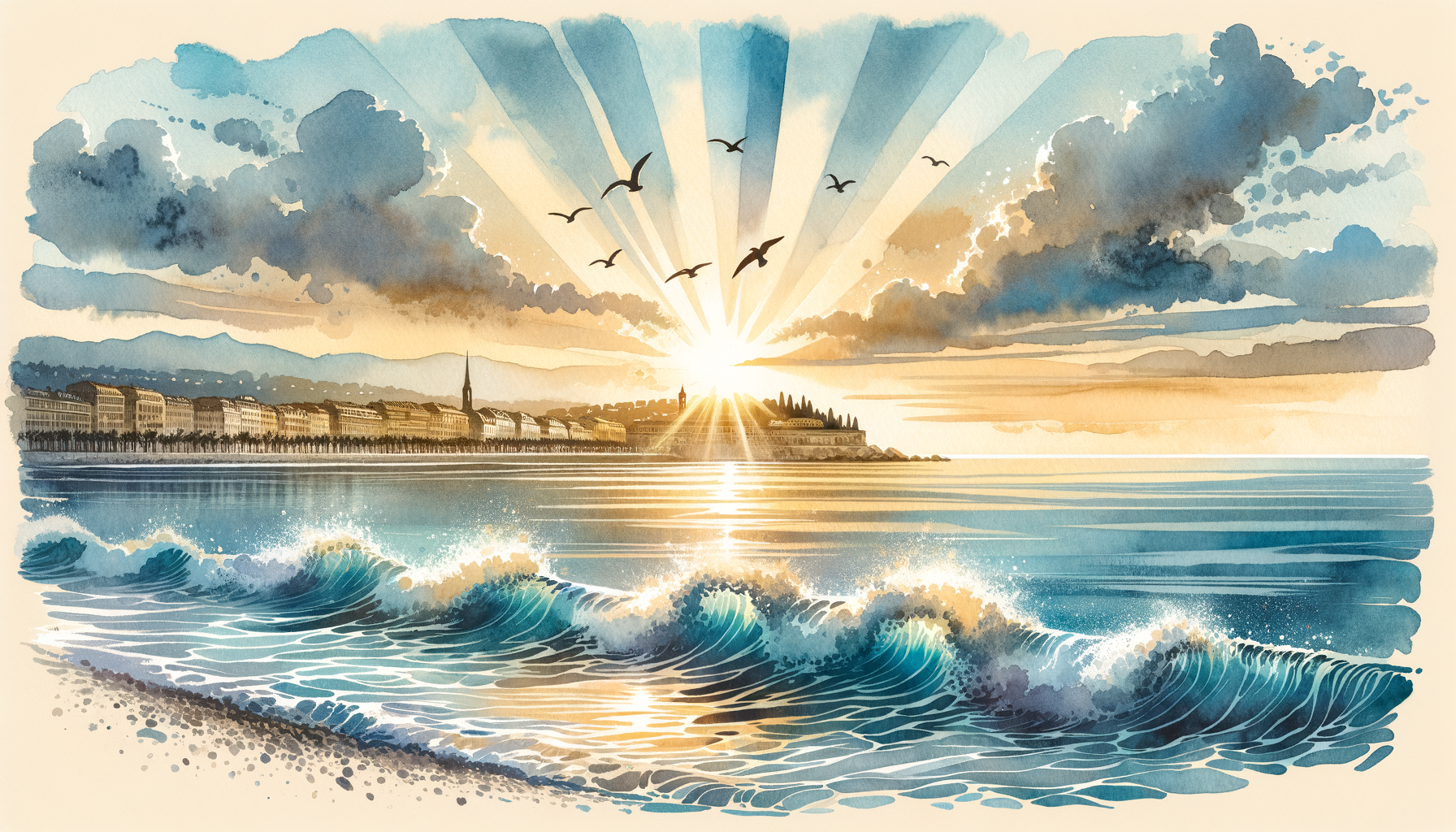 Промпт: "Изобрази пейзаж с волнами, отражающими лучи закатного солнца и птицами, парящими на фоне горизонта".