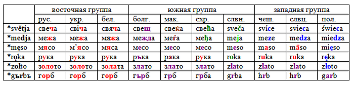 Проиллюстрирую таблицей, как это работает в случае славянских языков. Возьмём несколько фонетических изменений: