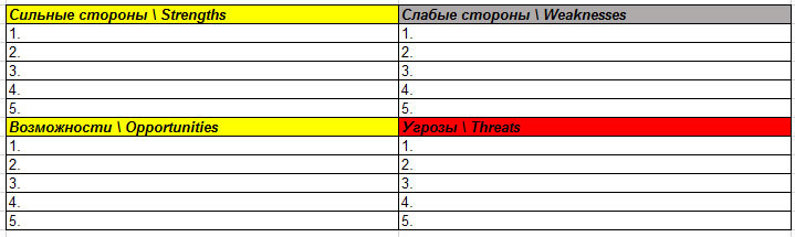 В разделе «S» (Strengths/Сильные стороны) перечисляются ключевые сильные стороны компании. В разделе «W» (Weaknesses/Слабые стороны) сильным сторонам компании противопоставляются ее слабые стороны. Раздел «O» (Opportunities/Возможности) содержит ключевые возможности для компании — как во внешней среде (например, выход на новые рынки), так и внутри самой компании (например, развитие кадров). И, наконец, в разделе «T» (Threats/Угрозы) перечисляются ключевые угрозы (риски) — как во внешнем окружении (например, обострение конкуренции), так и внутри самой компании (например, уход ключевых сотрудников).