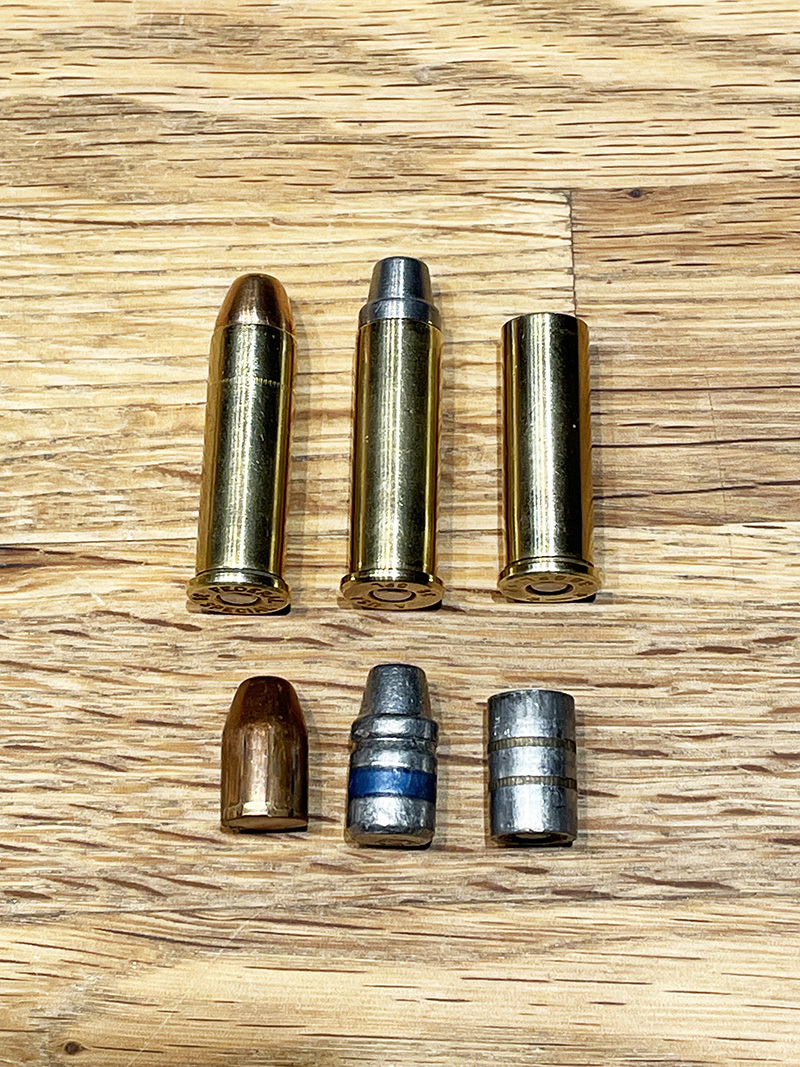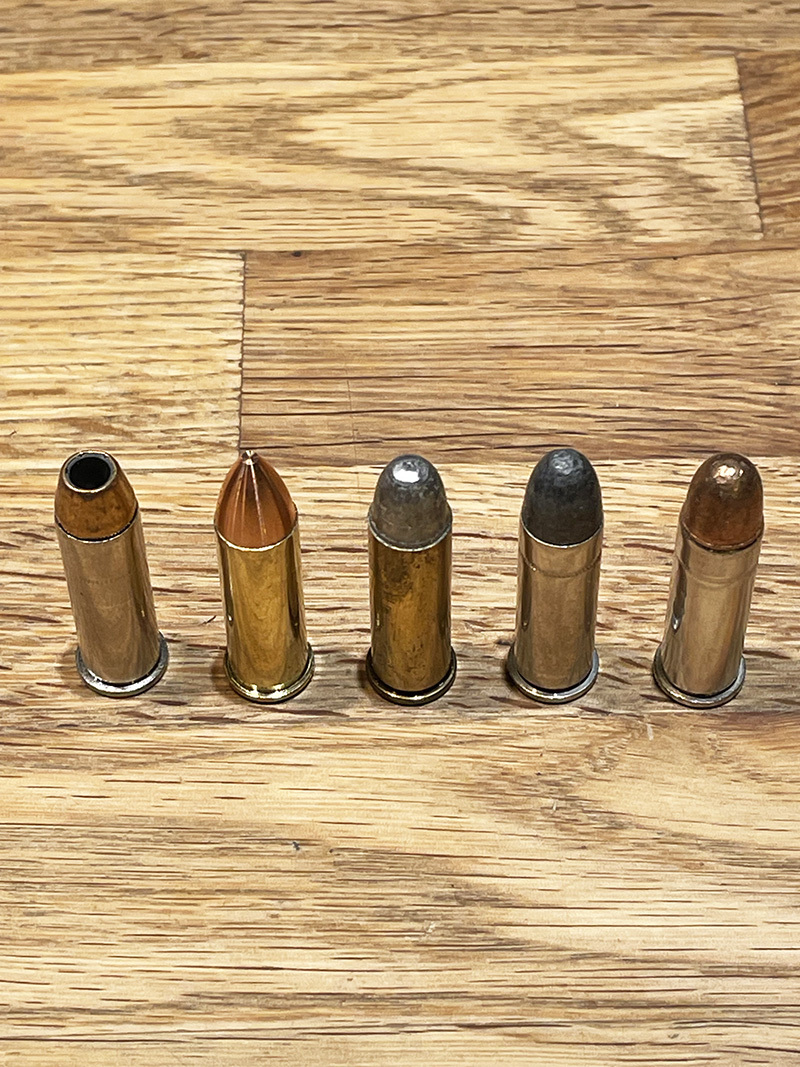 На фото ниже я положил рядом три патрона и три пули, которыми эти патроны снаряжены. Слева - свинцовая пуля с оболочкой, в центре - пуля, которая называется semi-wadcutter (полу-пыжерезка) и справа настоящий бочонок wadcutter.