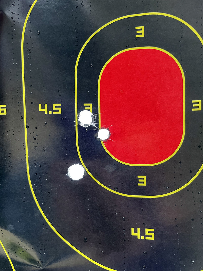 И вот так выглядит мишень после трёх попаданий.. Попадание в красную зону - это обычная оболочечная пуля, в 3 - это semi-wadcutter, и в 4.5 - это ровненький кружочек, который вырезала пуля wadcutter.