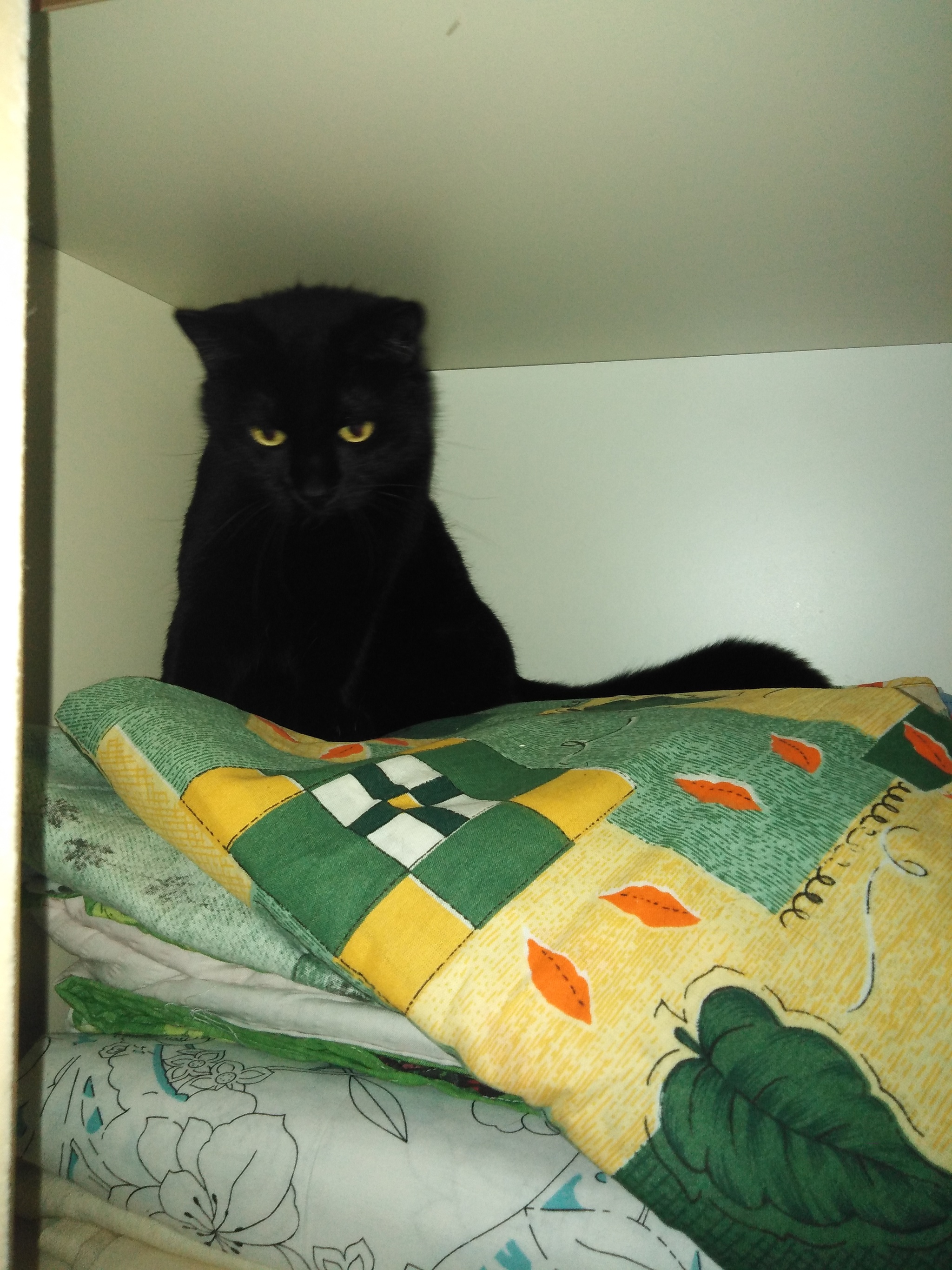 Мой и изнутри открывать умеет, выспится и вылезает. Иногда утром, когда собираюсь на работу, сидит рядом и орёт, мол "закинь меня наверх в шкаф", туда, где одеяла лежат. А оттуда, свысока, лежит и смотрит, как я собираюсь, а потом там и остаётся спать)