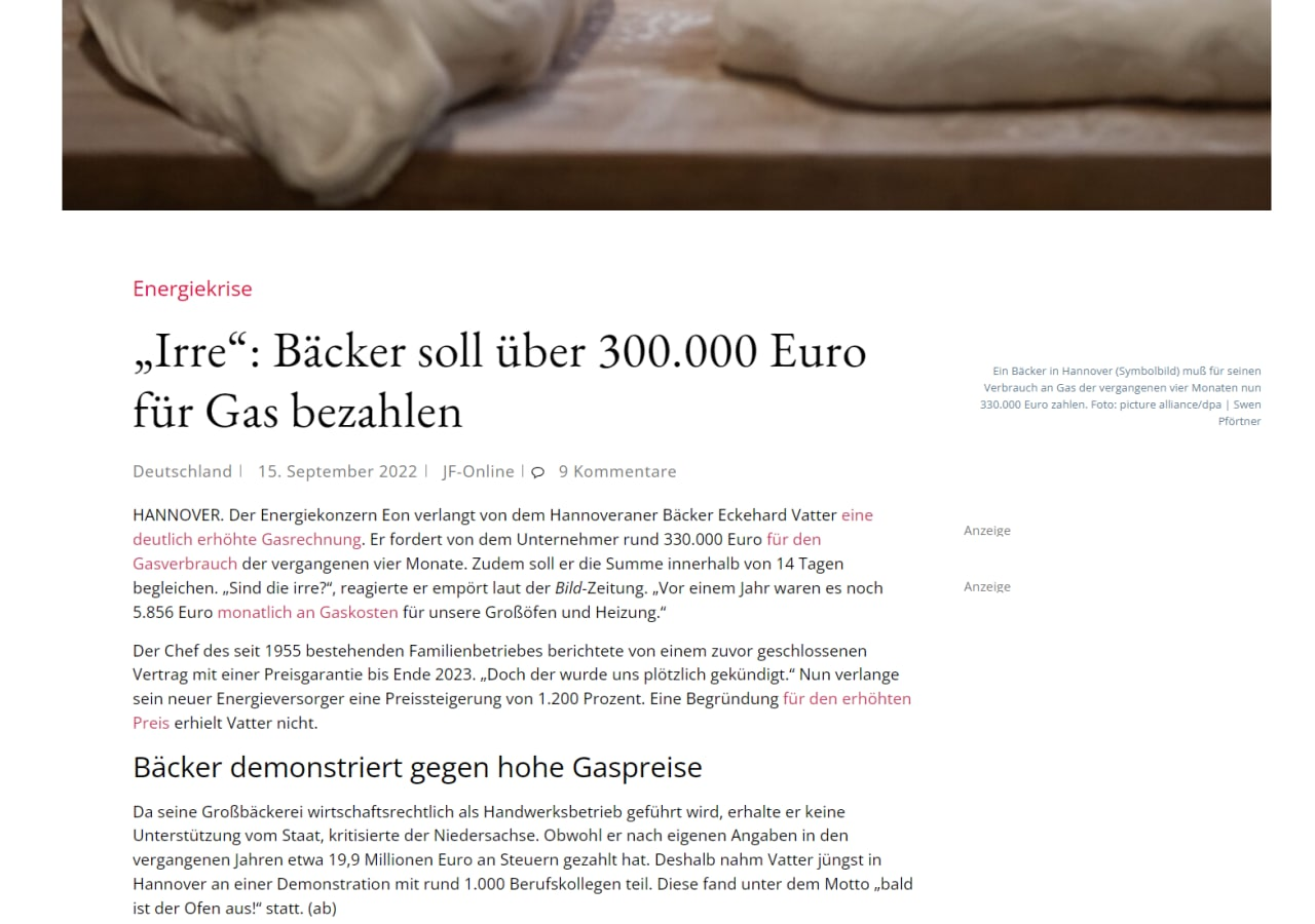 Жил себе в Ганновере пекарь. Экехард Ваттер. Пёк хлеб. Платил за газ 5 856 евро в месяц. А потом бац, и выставляет ему немецкий «Газпром» Eon счет за 4 месяца на 330 000 евро. Экехард Ваттер спросил Eon: «А что случилось?» Ведь так получилось, что контракт у него был с гарантией цены до конца 2023 года. Но не ответил Eon Экехарду.