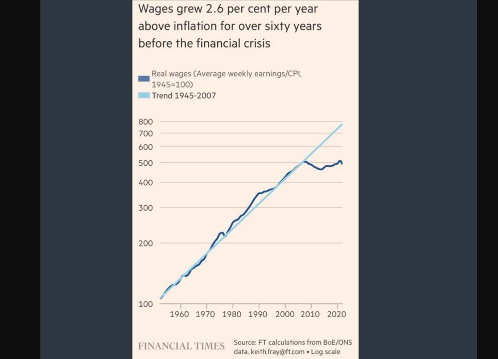 Вот Financial Times дает графику, что как-то не всё хорошо. Пишут, реальный доходы граждан росли всю дорогу с 1945 по 2007 год. А потом бац… и не росли. Что-то случилось после того кризиса. Выбились доходы из восходящего тренда. Неужто колониальная экономика начала схлопываться? И немедленно надо найти новую жертву.