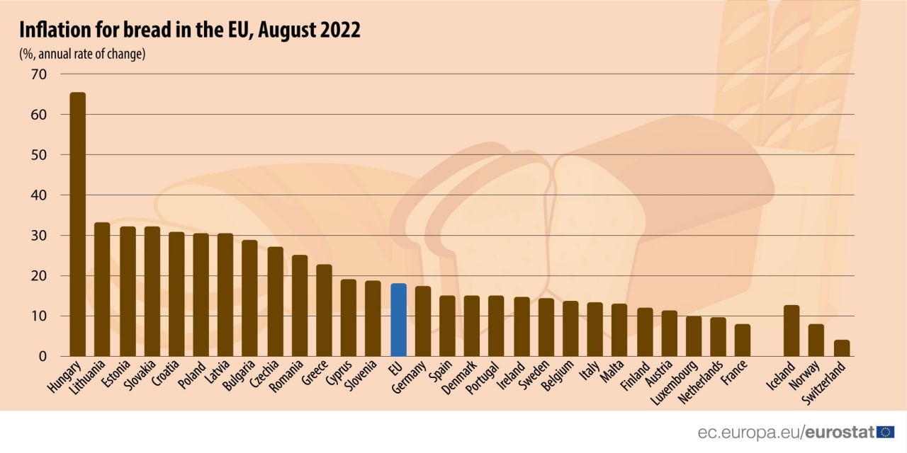 Хлебушек стал дорогой. В Венгрии рост дошел аж до 66%. В Литве — 33%. Ну что поделать, в голове хлебушек. Вот и растет хлебушек.