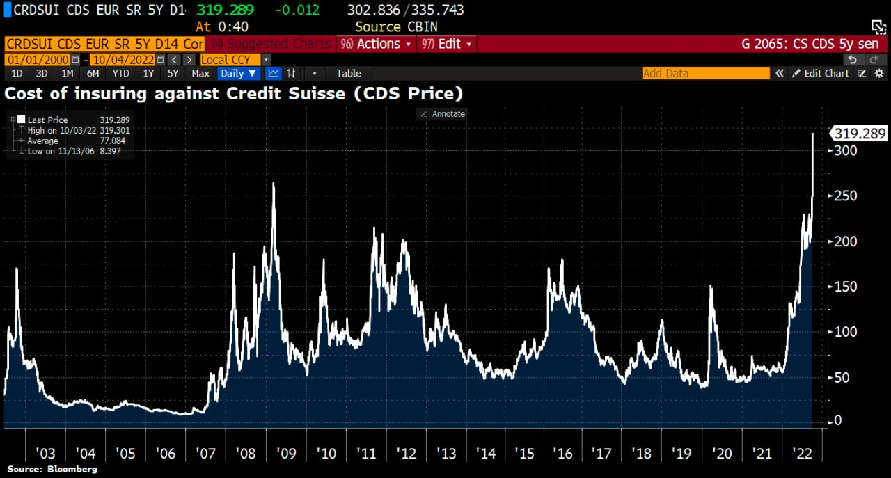 CDS на Credit Suisse показали максимальные значения за всю историю наблюдений, перепрыгнув значения 2009 года. Всё это произошло на фоне попыток их СЕО успокоить граждан, что подействовало с точностью наоборот