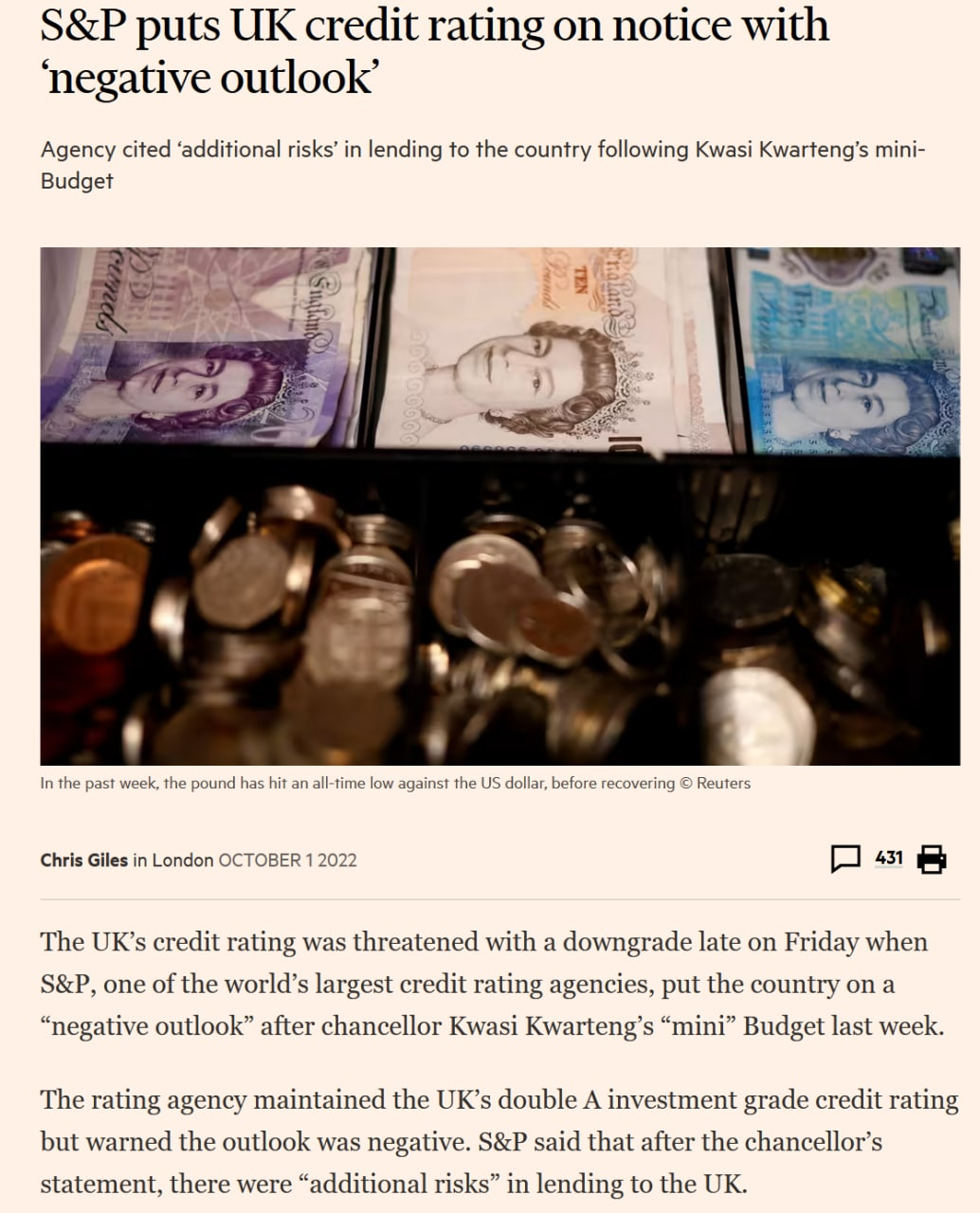 Оказывается, еще в пятницу рейтинговое агентство S&P мерзко окатило Британскую державу. Сохранило кредитный рейтинг АА, НО... прогноз поставило НЕГАТИВНЫЙ.