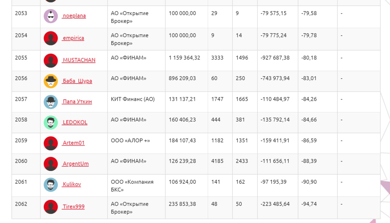 Я понимаю, что нет ничего приятнее чем лицезреть денежные потери другого человека, поэтому на втором скрине самая большая "отрицательная" доходность в категории участников "трейдер-капиталист" (участники конкурса с депозитом в 3 млн.руб. и выше). Вот, некто "San4es" слил уже 9,3 млн.руб.