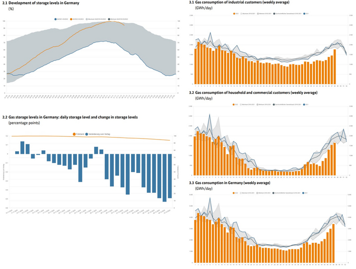 Потребление газа на неделе, начавшейся 28 ноября 2022 года, было на 13% ниже среднего потребления за последние четыре года и почти на 14% выше по сравнению с предыдущей неделей. Потребление значительно превысило уровень, необходимый для достижения цели по экономии газа. Температура была на 0,2°C ниже, чем в предыдущие годы.