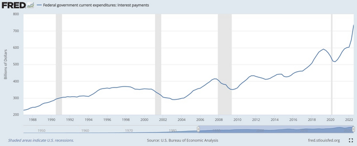 А вот так выглядят квартальные процентные расходы по долгу США. Ну те самые трежеря, которые выпускает их казначейство.