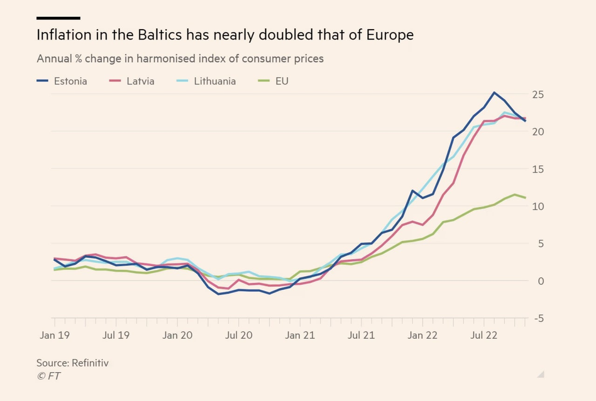 В данной статье будет много рассказов, отчего так страдают европейцы и не страдают гордые прибалты. Ведь прибалты так долго были оккупированы "ужасным совком", что теперь им море по колено. Чего они только не натерпелись в те времена. И вот теперь, когда они по-настоящему свободны и сильны, инфляция в 20% им нипочём. Мало того, они есть паровоз Европы, и остальную Европу всё это только ожидает. А вот им уже не страшно.