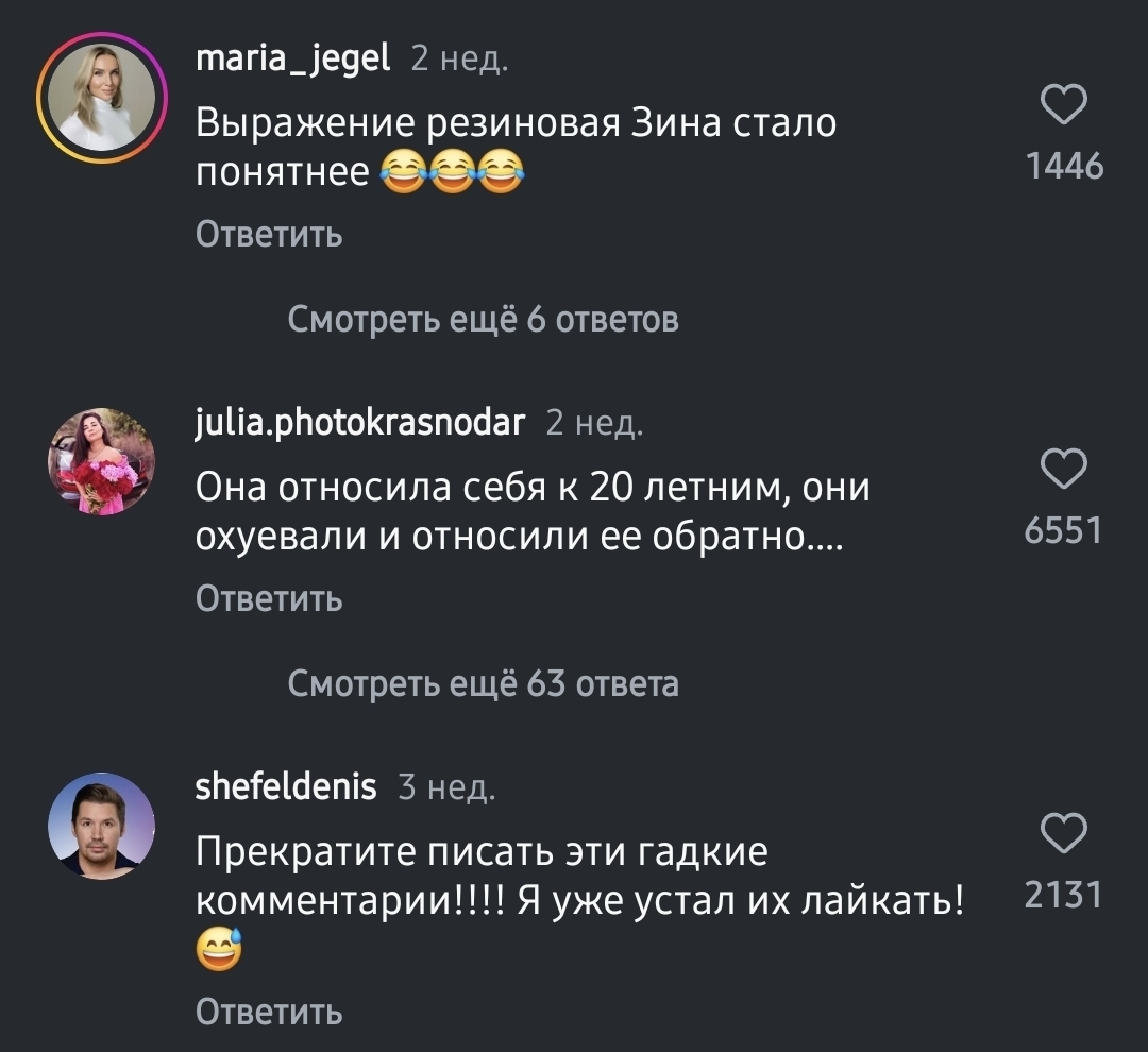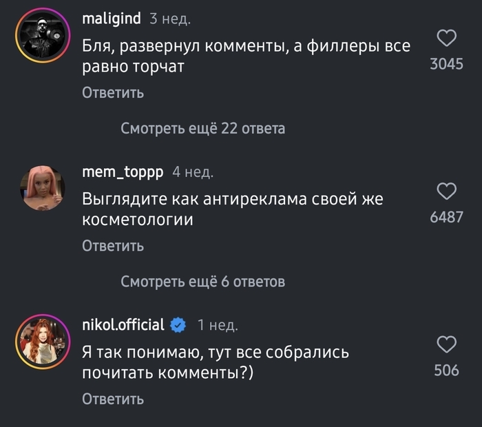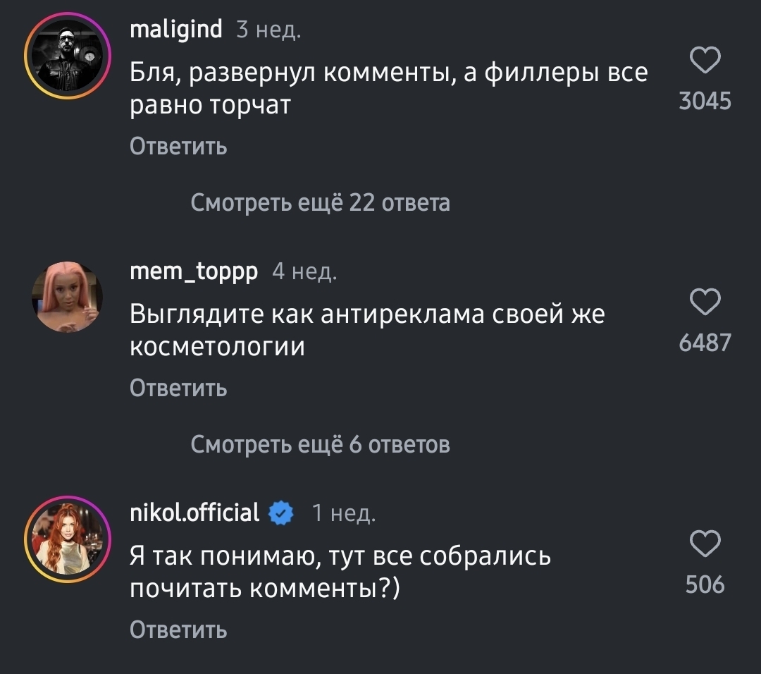 Я, справедливости ради, когда увидел скрин здесь, подумал, это отёк после операции или нечто подобное, или вообще фейк. Но, блин, она реальная и такая, как на скрине. Зачем, не понимаю, такое делать с собой, и ведь у неё куча воздыхательниц. 🫣 Может пиар своеобразный. Ужас, блин