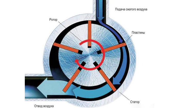 Пневматический двигатель, иначе называемый пневмоцилиндром, преобразует энергию расширяющегося воздуха в механическое действие. По рабочему принципу он аналогичен гидравлической силовой установке. Главным элементом пневмодвигателя является поршень, к которому прикреплен шток с навитой на него пружиной. Воздух, поступающий в камеру, с увеличением давления преодолевает сопротивление пружины и перемещает поршень. На фазе выпуска, когда давление воздуха падает, пружина возвращает поршень в исходное положение, после чего цикл повторяется.