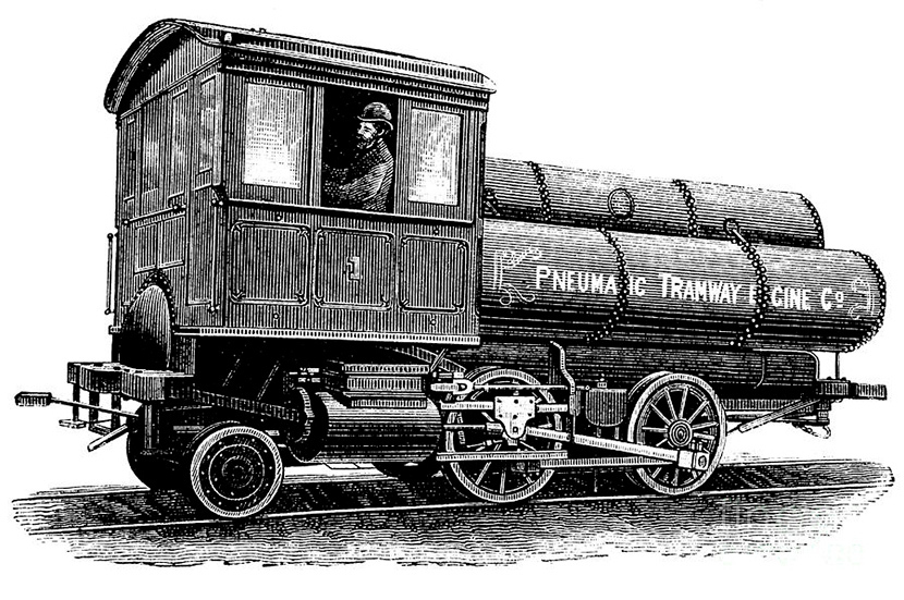 Одним из родоначальников пневмодвигателей в наземном транспорте был француз Луи Мекарски, разработавший подобный силовой агрегат для парижских и нантских трамваев. В Нанте такие машины прошли успешные испытания уже в конце 70-х годов XIX века, а к 1900 году Мекарски владел парком из 96 трамваев, что доказывало эффективность выбранной им технологии (что, впрочем, не помешало заменить их электрическими аналогами).