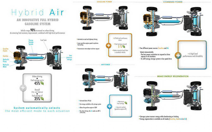 Однако консорциум Peugeot-Citroёn взглянул на пневмодвигатели под иным углом, задумавшись об их использовании в качестве дополнительного источника энергии для своих гибридов. Так, в 2016 году в качестве эксперимента часть кроссоверов Peugeot 2008 была оборудована дополнительным двигателем Hybrid Air. Система была разработана в сотрудничестве с компанией Bosch, суть ее заключается в том, что энергия ДВС запасается не в виде электроэнергии, как в обычных гибридах, а в баллонах со сжатым воздухом.