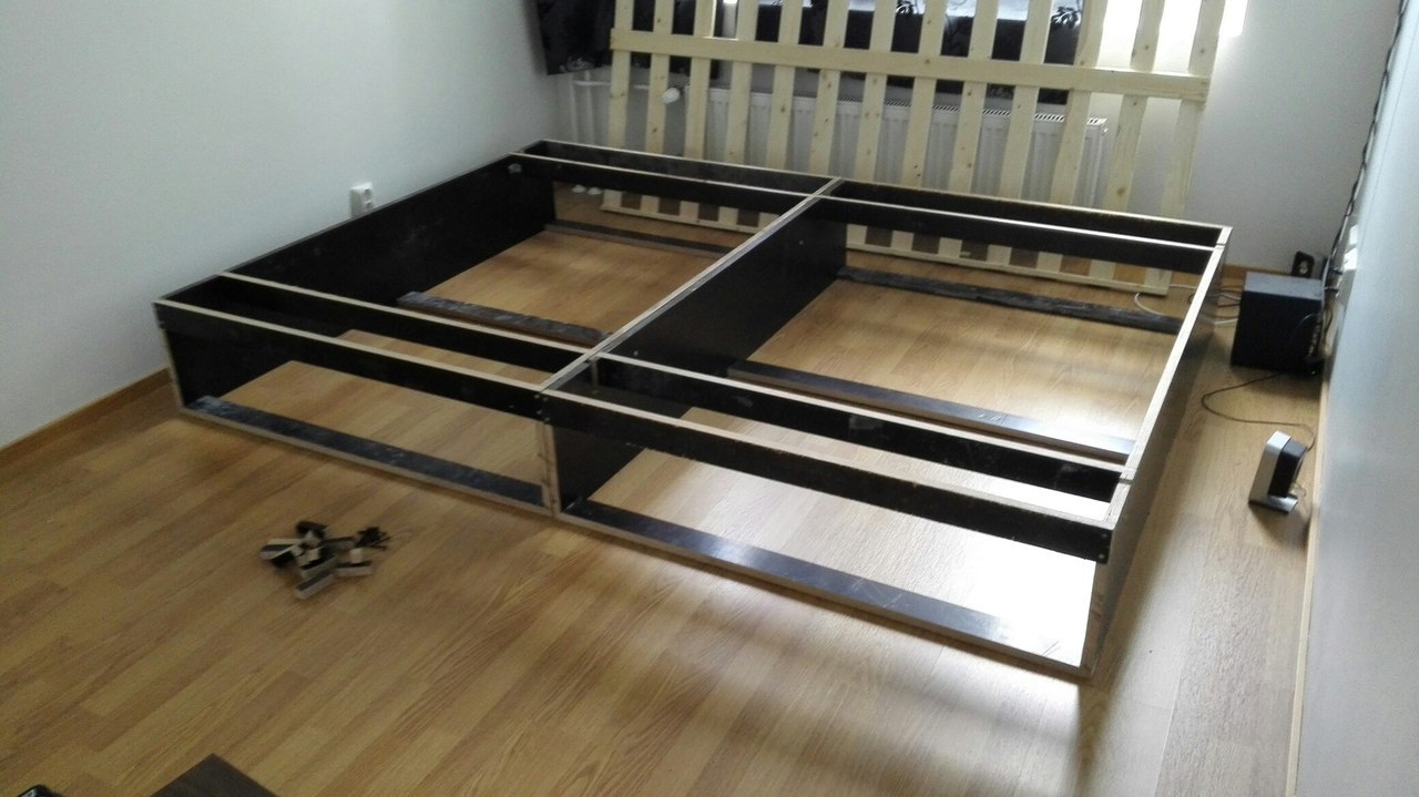 Поскольку фанера предназначена для выдержывания слонов, она имеет большую массу. Дабы кровать была мобильна, я сделал ее из двух частей, как показанно на картинке.