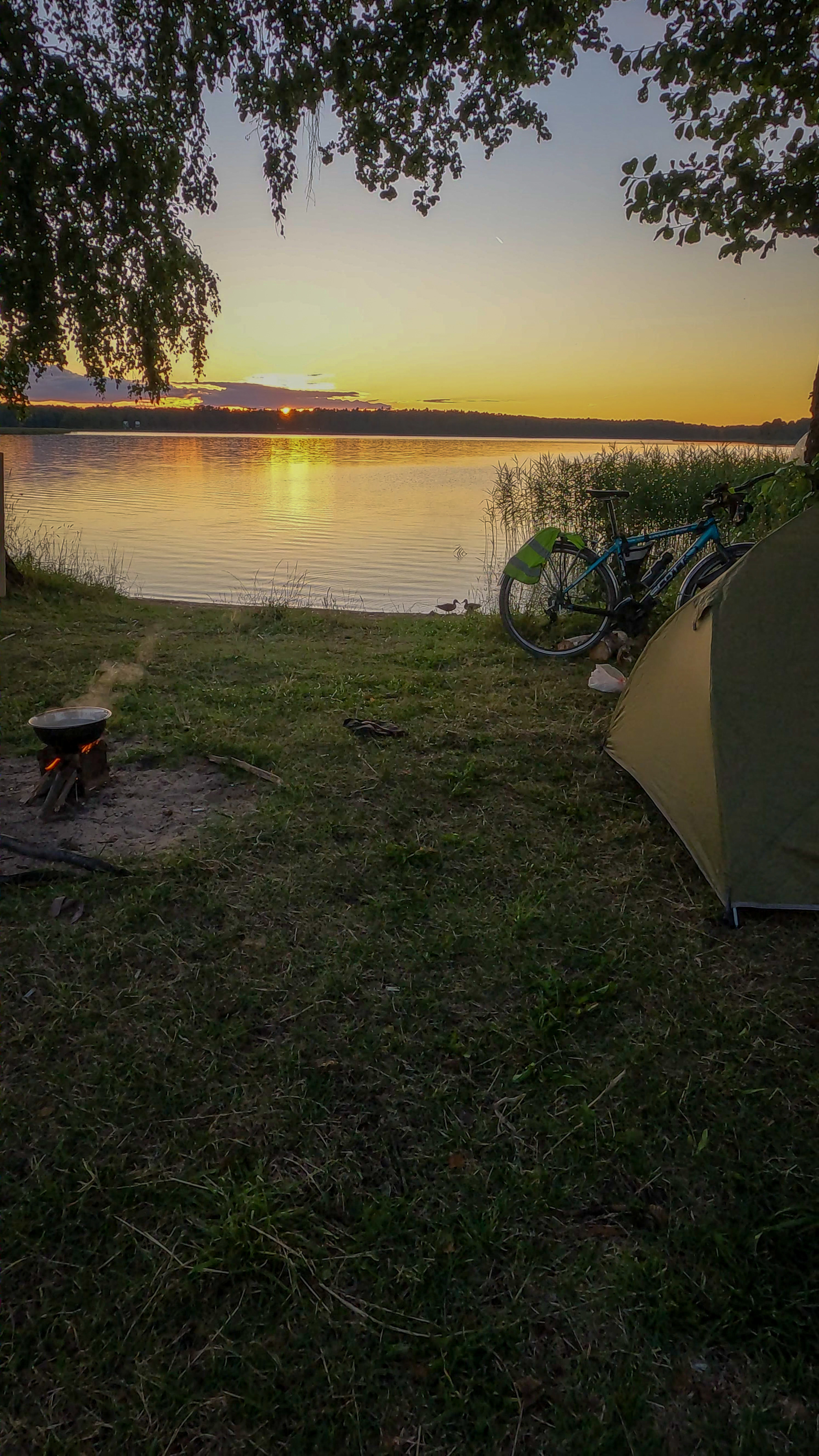 У меня с собой два шампура, которые я подобрал. Нахожу или делаю сам мангал и готовлю. Люди часто оставляют на берегах озёр мангалы, угли, дрова. Также собираю угольки и дрова в остатках костров.