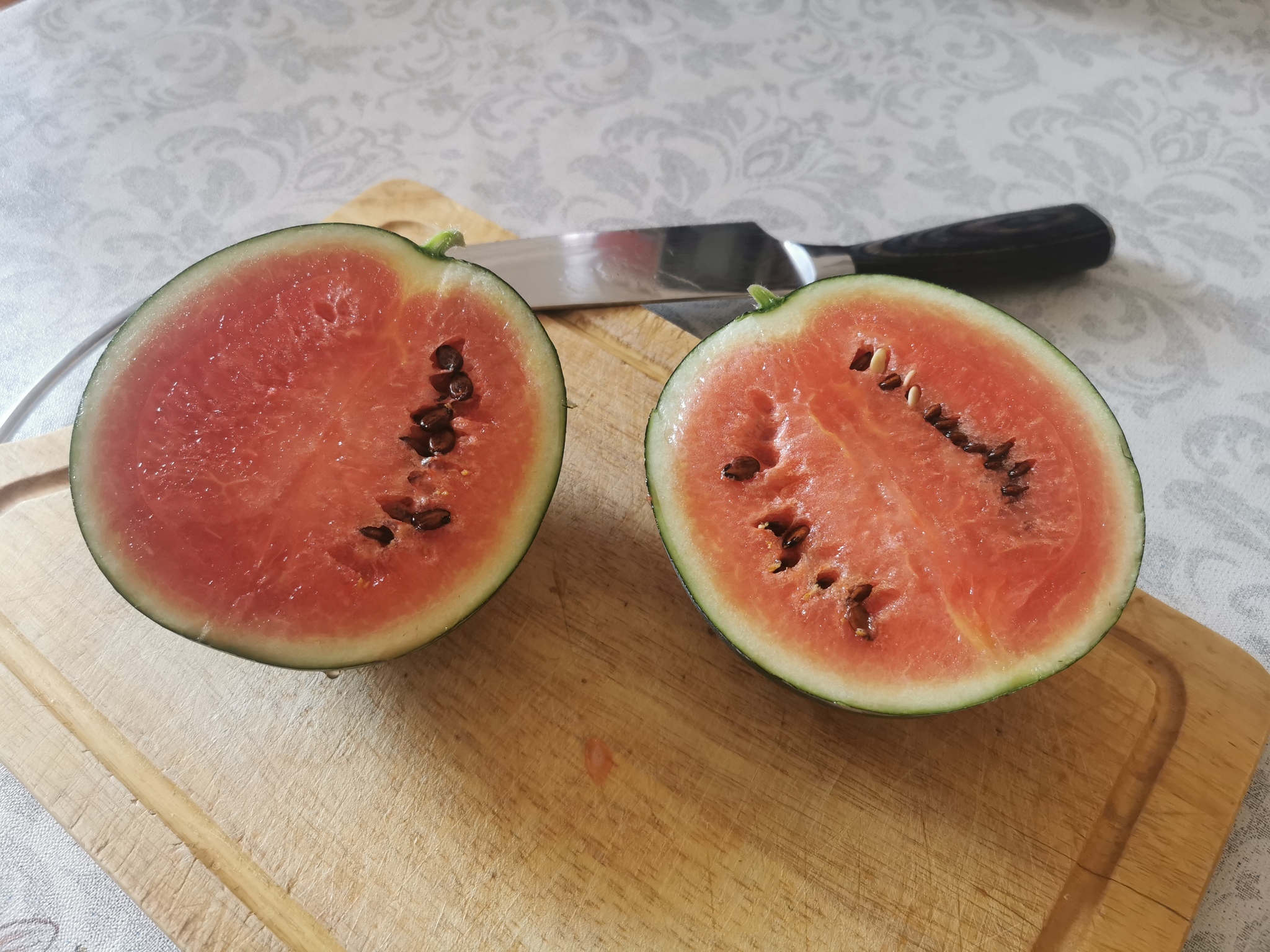При разрезе трещал и оказался сочным, честно боялся, что будет недоспелым, но созревание прошло удачно. Арбуз ароматный и сладкий. Эксперимент по выращивания арбуза на подоконнике считаю успешным, на следующий год буду сажать ещё.